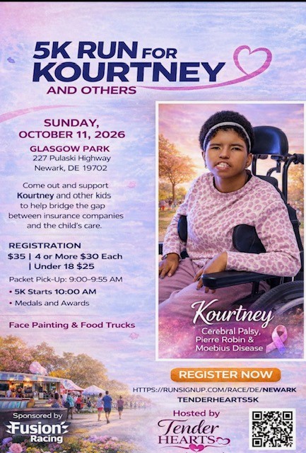 Join us for the 5K Run for Kourtney and Others on Sunday, October 11, 2026 at Glasgow Park, located at 227 Pulaski Highway, Newark, DE 19702.