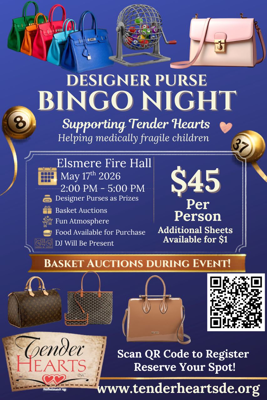 Join us for an exciting afternoon of fun, prizes, and community support at our Designer Purse Bingo Night, benefiting Tender Hearts and helping medically fragile children.