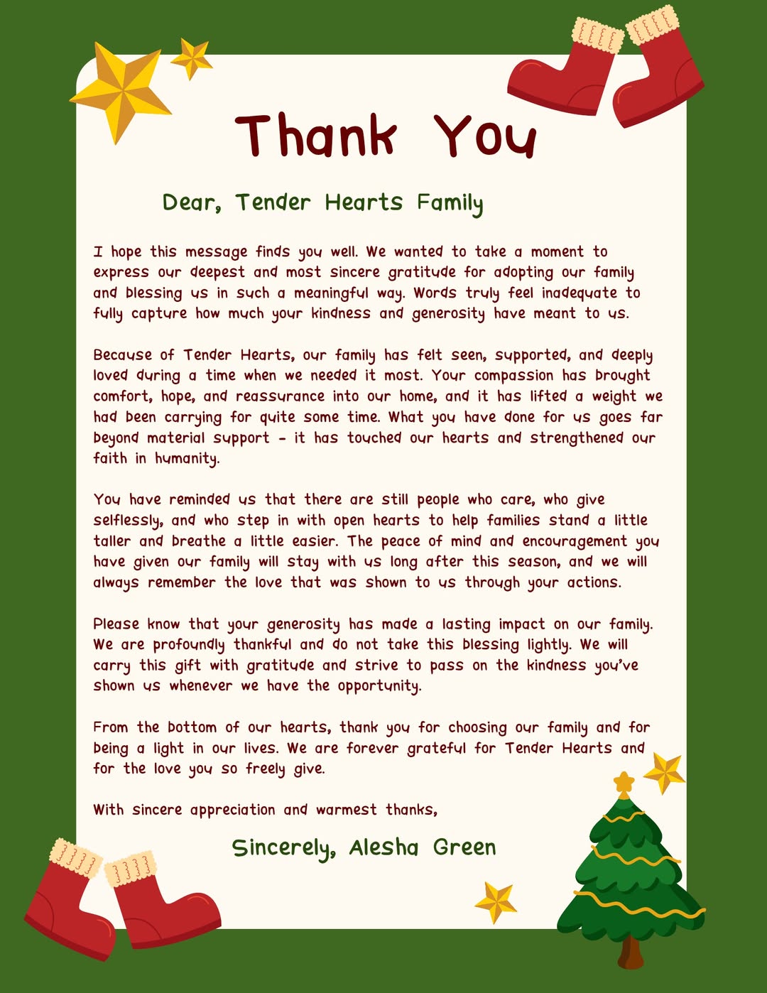 Thank you for applying for the Adoptive Family Program for 2025 Season. The program is now closed for this year. If you received notification that you were accepted, delivery will be on December 13, 2025. You will receive an email from us concerning delivery. It is important to check your emails and respond accordingly or your delivery may be cancelled. The Board of Tender Hearts wishes you a very Healthy, Happy and Safe Holiday.